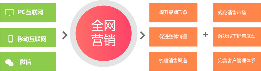 全网营销是全网整合营销的简称,集PC互联网、移动互联网、微信于一体,以实现全渠道营销。